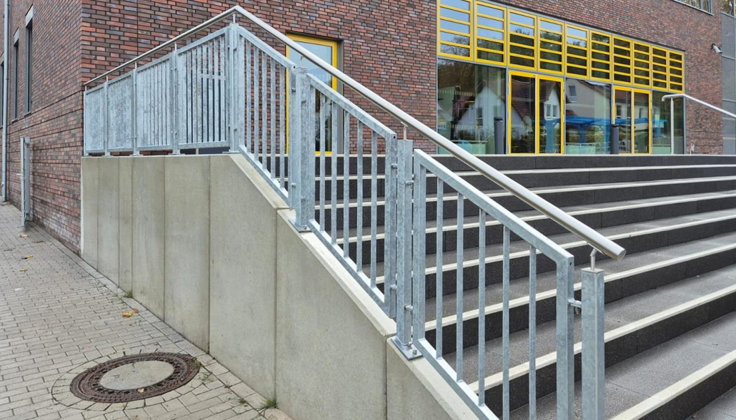 An der Grundschule in Dortmund-Huckarde wurde eine Stahl/Edelstahl-Kombination verbaut. Die untere Konstruktion besteht aus Feldern, die mit Quadratrohr und senkrechten Stäben als Füllung zum Verlauf der Treppe schräg und damit passgenau gefertigt wurden. Der obenliegende Handlauf besteht aus einem mit Korn 240 geschliffenem Edelstahlrohr, das mit den Feldern verschraubt wurde.