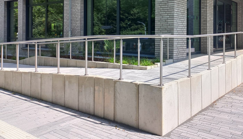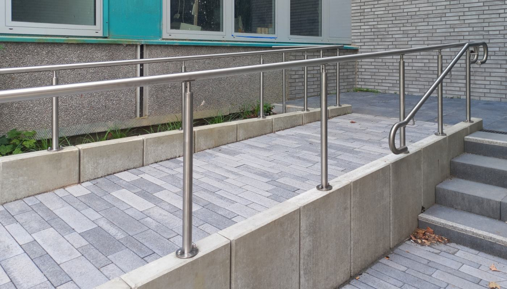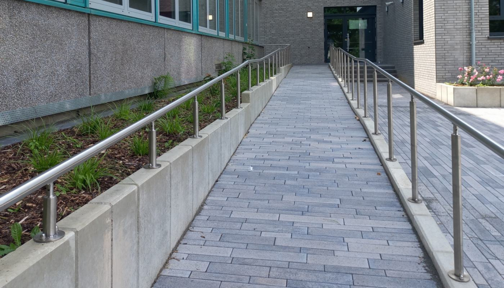 In Dortmund-Aplerbeck wurden eine neu erstellte Rampe sowie Zugangstreppen mit Handläufen aus Edelstahlrohr versehen. Die Konstruktion wurde zum Teil im Betrieb, aufgrund des teilweise ungleichmäßigen Untergrundes aber auch am Montageort passgenau verschweißt. Die Bodenbefestigung erfolgte durch Verschrauben auf den Kantensteinen und Treppenstufen. Die Enden der Geländer sind mit 180°-Bögen versehen worden.